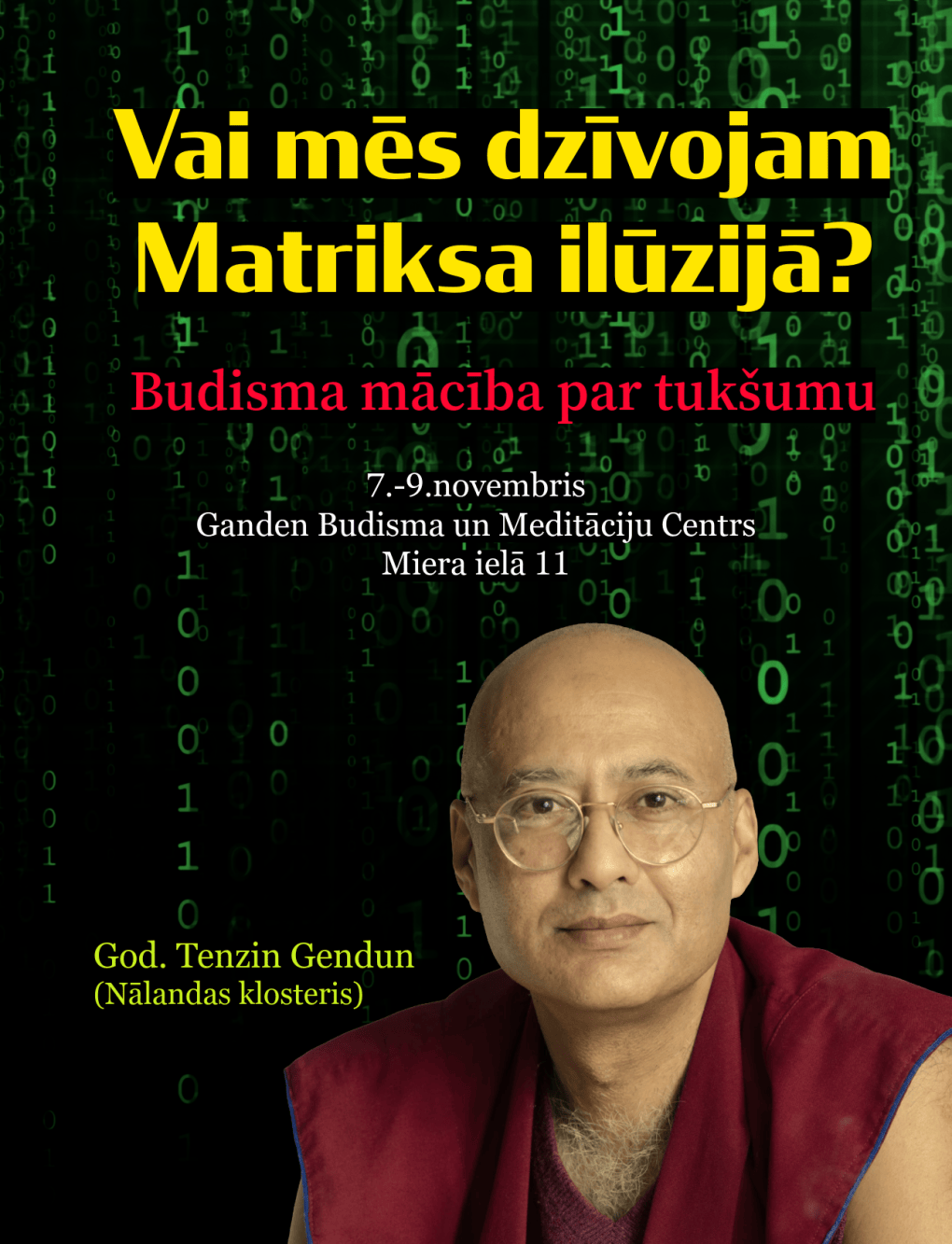 Aicinām Tevi no 7.-9. novemrim uz īpašu pasākumu, lekcijām ar vienu no asākajiem Nālandas klostera prātiem — cienījamo mūku Tenzinu Gendunu.