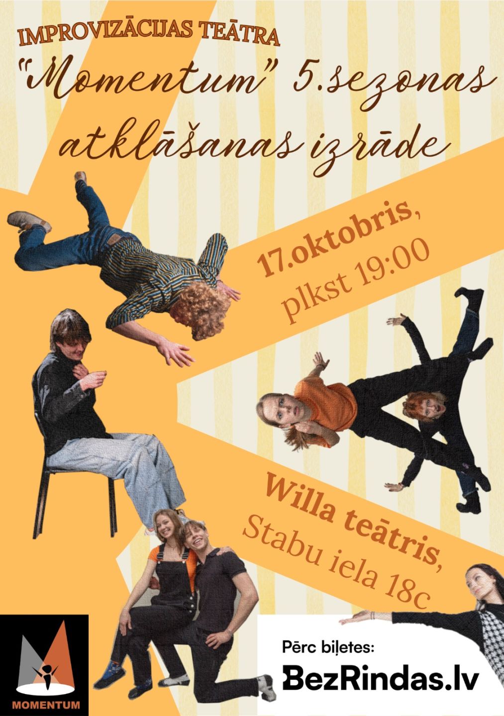 "Momentum" improvizatoru pieredzes pūrā ir jau vairāk nekā 10 izrādes, daudzi pasākumi un teātra sporta turnīri. Šosezon, līdzīgi kā iepriekš, skatītāji tiks priecēti gan ar īsās, gan garās formas improvizāciju, un noteikti būs arī kāda "Momentum" izpildījumā vēl neredzēta improvizācijas teātra spēle!