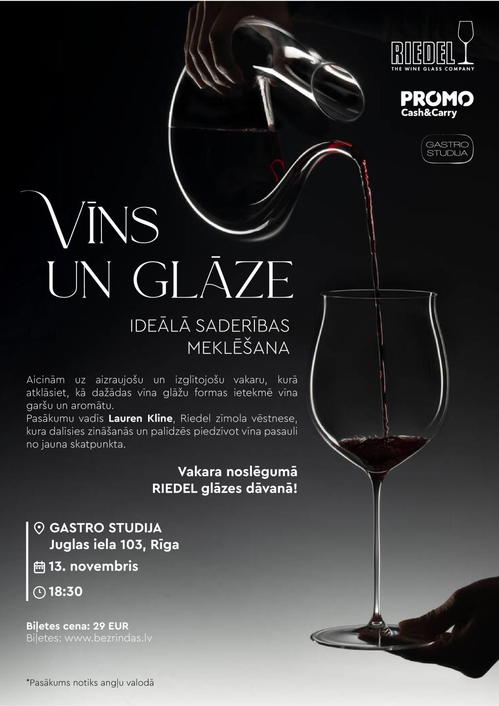 Pasākumu vadīs Lauren Kline, Riedel zīmola vēstnese, kura dalīsies zināšanās un palīdzēs piedzīvot vīna pasauli no jauna skatpunkta.