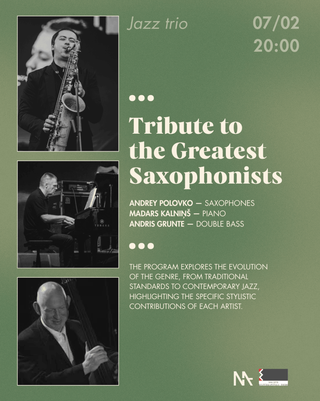 7. februārī jauno sezonu turpinās Andreja Polovko trio ar programmu, kas veltīta džeza saksofona meistariem. Koncertā skanēs kompozīcijas no tādu mūziķu repertuāra kā Gerry Mulligan, Stan Getz, Joshua Redman un Grover Washington Jr u.c.