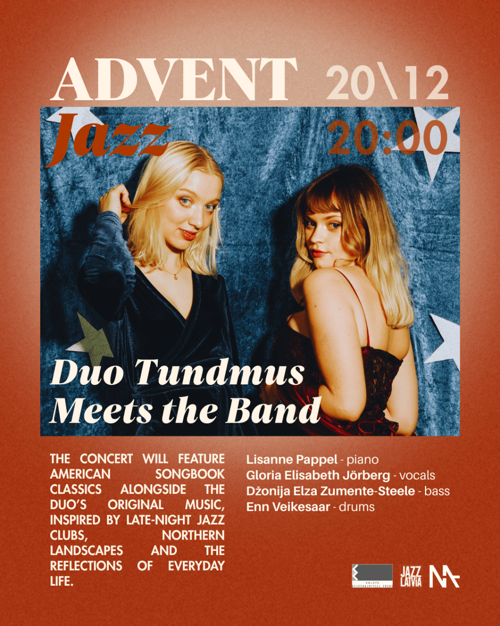 On 20 December, MASA continues its Advent Jazz series with “Duo Tundmus meets the Band” — a project by long-time collaborators pianist Lisanne Pappel and vocalist Gloria Elisabeth Jörberg. Formed in Estonia and further developed in the Netherlands, the duo blends the spirit of 1930s–50s traditional jazz with an Estonian sense of intimacy and lyricism — a feeling reflected in their name “Tundmus” (“sensation”, “emotion”).