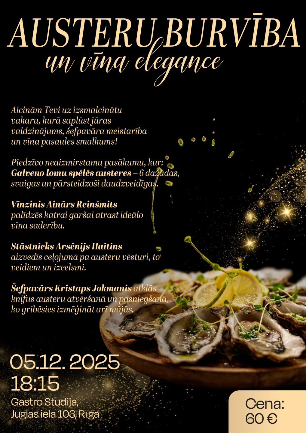 Sagaidīsim Jūs ar gardām uzkodām, izcilām austerēm un pieskaņotiem vīniem.