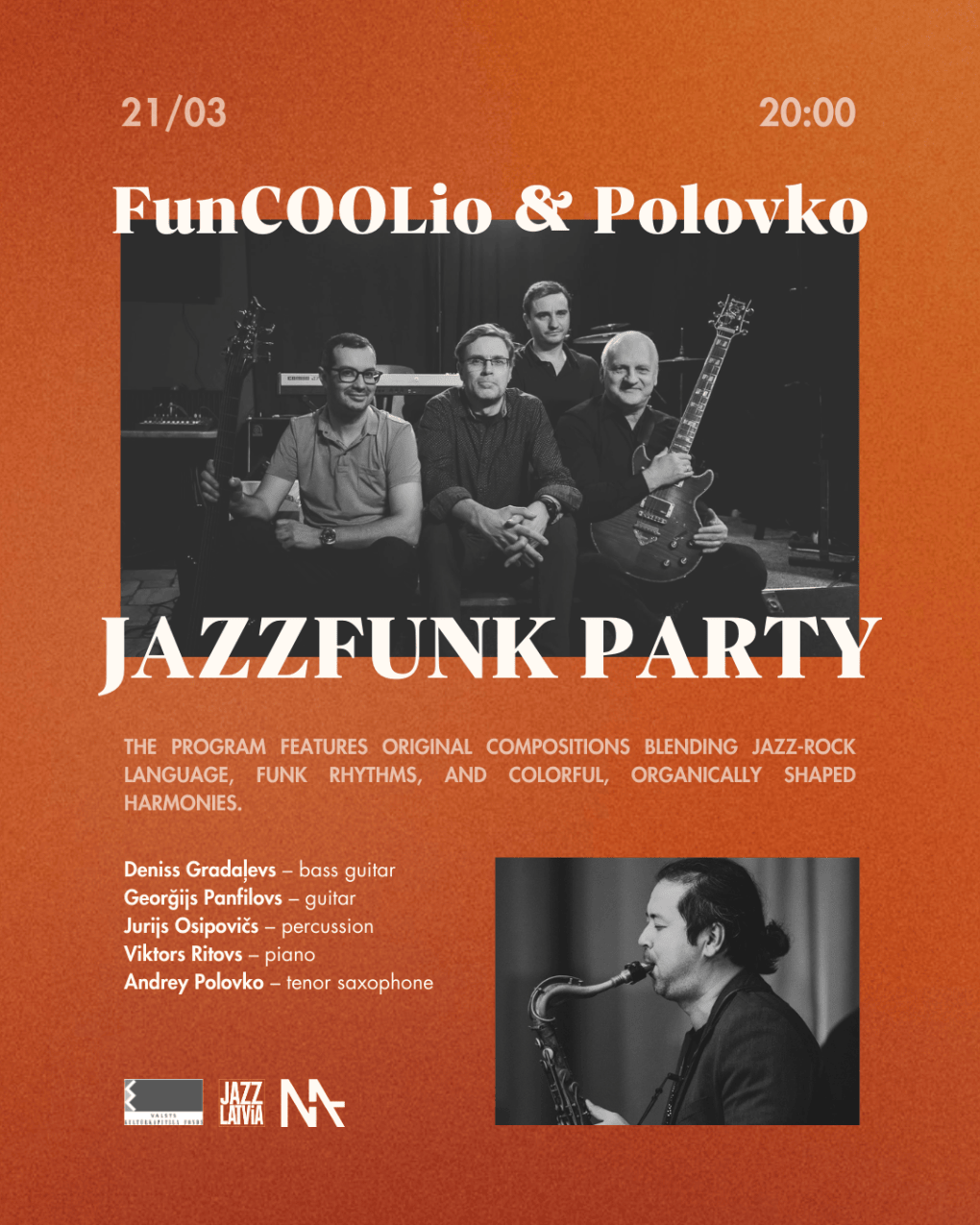 21 марта в джаз клубе MASA прозвучит энергичная программа в стиле Baltic Fusion, объединяющая джаз и фанк. На сцене выступит инструментальная группа FunCOOLio, к которой в этот вечер присоединится саксофонист Андрей Половко.